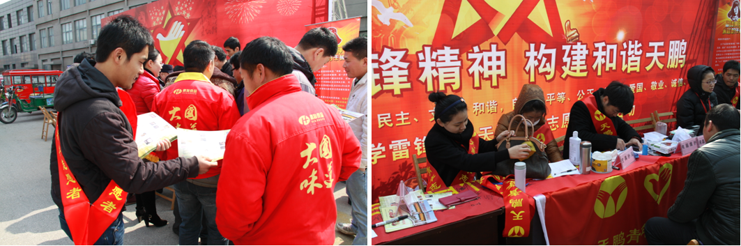 2014年3月5日,为了弘扬雷锋精神及“奉献、友爱、互助、进步”的志愿者精神,进一步体现公司全心全意为经营户服务的宗旨,无锡天鹏菜篮子团支部在3月5日开展了以“弘扬雷锋精神,构建和谐天鹏”为主题的百人签名活动和面向广大经营户朋友的青年志愿者便民服务活动。
