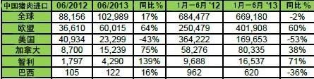 中国上半年直接进口的猪肉与猪杂下滑2%,为669,180吨,报告指出来自欧盟的进口量增加60% (401,908吨),反映出德国与丹麦成长强劲,但波兰也是中国的新进口国。美国肉类出口协会扣除(香港来自中国及香港的再转出口量来计算) 尤其是猪杂美国进口量相对减少,造成此情形的部分原因,可能是中国今年春季开始执行的莱克多巴胺文件证明之新规定,再加上今年年初美国与中国活猪价格价差不大–中国活猪价格偏低–美国价格则较高。不过目前该情形有变化,中国与美国活猪价差开始扩大,中国价格持续上扬,而美国价格逐渐转缓。这将在下半年进一步刺激中国的需求量–下半年度猪肉消费量与进口量通常会季节性增加。