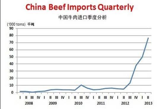 中国6月的牛肉进口量较4月及5月水平略减,但已连续第三个月超过25,000吨。2010年官方报告该年全年进口量近25,000吨。在国内产量无法满足消费量的情况下,中国牛肉需求量飞涨。2013年上半年中国的牛肉进口量为126,013吨,分布比例如下:澳洲(市占率47%)、乌拉圭(25%)、新西兰(18%)、加拿大(8%)及阿根廷(小于1%)。香港2013年上半年的牛肉进口量也创下纪录,为176,716吨,较去年上半年所创的纪录成长85%。中国已经迅速成为澳洲与乌拉圭的战略性出口市场。中国是澳洲牛肉的第四大进口市场,为乌拉圭牛肉的最大进口国。在2012年时,中国甚至还不是乌拉圭牛肉的前十大进口国之一。